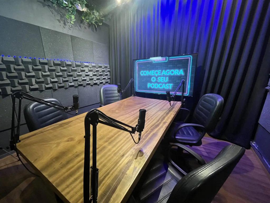 Nosso espaço é completo e acolhedor para que se sinta a vontade na hora de gravar seu podcast.